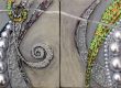 원형에 더해 최근 방형(方形, 사각형)이 등장하는데 울퉁불퉁한 가장자리가 그대로인 시멘트 패널도 등장하면서 화면 내의 긴장이 더 강화된 듯하고 전시된 현장은 더욱 리드미컬하다. 이 사각형을 보면 사각 위에 사각을 겹치는 작가, 가장 완전한 형태로서의 사각형을 추구한 작가, 말레비치가 떠오른다. 다른 차원 즉 4차원의 그림자로서 우리에게는 사각형으로 제시되는 말레비치의 사각형을 다시 n차원의 추상공간으로 돌려보낸다면 거기에는 숨, 알, 원, 흐름, 기운 등이 알 수 없는 형상으로서 그냥 잠재의 덩어리가 되지 않을까. 작가는 이미 <4차원으로의 여행>(갤러리 인데코, 1997)이라는 전시를 개최한 바 있으며, 당시 출품작 <상징적 우주>(1997)에는 말레비치가 상상했던 방형의 행렬이 떠다니고 있다. 이렇게 본다면 원형과 방형, 그 위에 놓인 얼룩, 흔적들은 다른 차원에서 온 것에 몸을 부여한 것이라 할 수 있다. 작가는 실제로 몸을 관찰하고 기록하는 작품을 진행하기도 했는데, 자기 몸의 한계, 그 경계를 척도로 작업을 해 오기도 했다. 초월의 장소이면서 추락의 장소이기도한 몸은 물질이면서 정신으로서 조기주 작품을 은유하는 용어이다. 그렇다면 ‘추상과 구상 사이’에 자리 잡은 그의 작업은 접신(接神)의 경계지대로서 몸과 우주의 동근원적인 파장이 퍼지고 모이는 제식의 장소가 아닐까 생각해본다. 자신의 작업을 조기주는 ‘여성적 연금술’이라 부른 바 있는데 지금의 시점에서 이를 ‘시멘트 제식’이라 불러도 무방할 듯하다. 이 제식의 상차림(작품)의 특징과 고유성을 구성하는 것이 ‘여성성’이라면 그것은 어떤 특징을 지니는 것인지 분석의 대상으로 남는다.